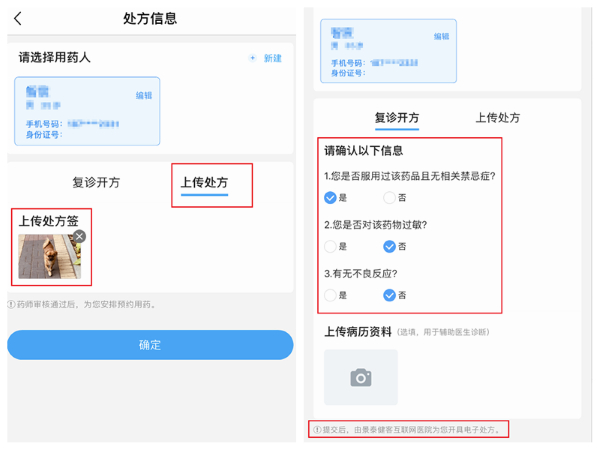记者选订60盒该药品后,在填写处方信息一栏,填写用药人个人信息(姓名可不实名填写)。在“复诊开方”选项,确认信息是系统默认,记者未做任何改动,上传病例一栏是选填,此外,页面最下方有小字提示“提交后,由景泰健客互联网医院为您开具电子处方”;在“处方信息”选项,记者上传一张小狗照片,系统显示上传成功,随后便可直接提交订单,付款进行购买。