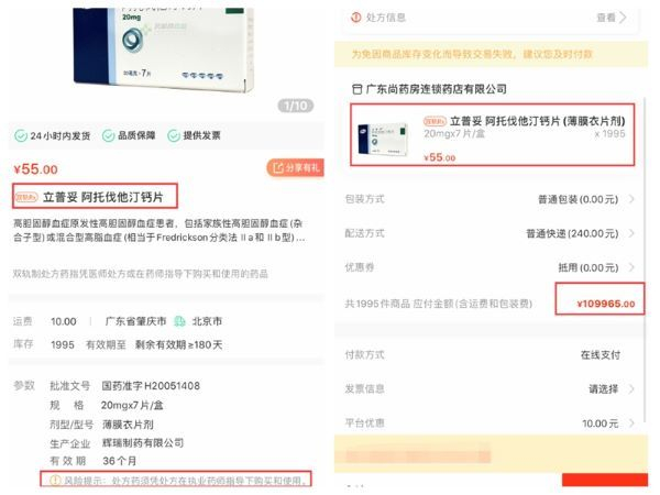 “药房网商城”的处方药“阿托伐他汀钙片(立普妥)”购买数量无限制