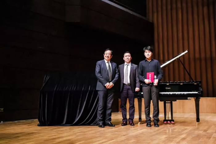 杭州师范大学音乐艺术学院院长田耀农先生(左)与和乐文化传播有限公司董事长翁寰先生(中)为要佳林颁发专业C组一等奖