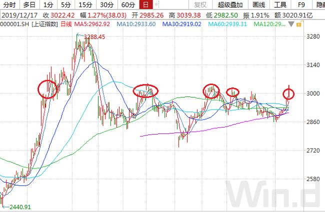 截至12月17日收盘,沪指再度站上3000点,整体看此次已是2019年第五次站上3000点,今年3月初,沪指首次站上3000点,随后一鼓作气冲上3200点,到5月份又再度回撤至2900点附近;6月中旬,沪指第二次站上3000点,而后又再度回撤,一度跌破2800点;9月初和10月中旬均站上3000点,但均没过几日便再度回调。11月初冲击3000点无果后,再度回调。
