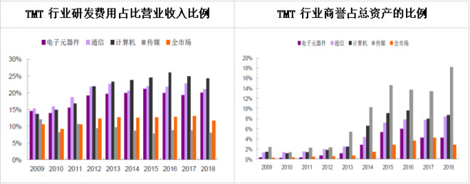 投资者关注TMT行业最主要的是关注相关上市公司的核心技术和其资产风险。从其历年TMT行业研发投入看,TMT作为高新技术的代表其业研发费用占比营业收入比例要明显高于全市场,几乎是全市场的两倍,其中计算机行业研发投资最高,传媒行业略高于全市场。由此可以看出TMT行业不愧是科技的集中营,超高研发投入是其具备高成长的核心要素。