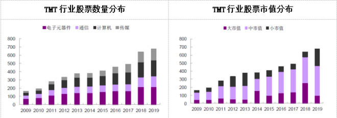 TMT行业近十年来发展迅速,2009年至2019年1月31日,从165只股票增长到680只股票。从各行业股票数量和市值规模看,计算机和电子元器件行业股票数量相对较多,但总体市值规模来看,计算机行业明显较小,主要是因为计算机行业,尤其是软件行业,轻资产运营特征明显,公司规模较小。(我们以沪深300成分股中市值最小的股票和中证500成分股中市值最小的股票作为标准划分大市值、中市值和小市值)