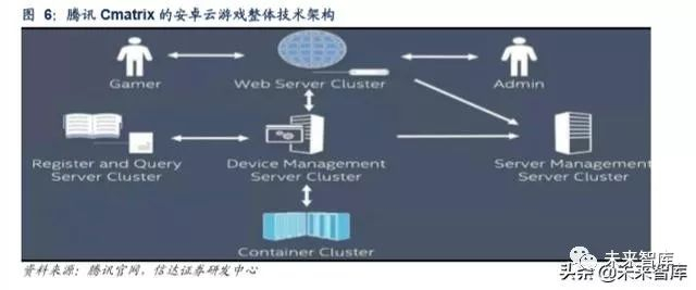 2)虚拟化技术:云游戏并非基于服务器个体,需要运行于庞大的服务器集群之上,需要通过虚拟化技术提供给用户。虚拟化包含虚拟机、容器等的隔离技术,还包括 GPU 的虚拟化(vGPU),GPU 虚拟化可以实现用户在多个虚拟机上对一块 GPU 的共享,提高利用效率。目前腾讯 CMatrix 采用的是容器方式进行安卓虚拟化,低成本,高性能。英伟达 全新的 GPU 虚拟化技术单台服务器最多可支持 48 路高清画质游戏的流式传输。