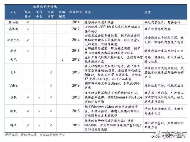 游戏开发商较为集中,第一梯队以腾讯、网易为代表,第二梯队以 A 股上市公司完美世界为代表;云计算提供商提供云 计算技术支持,接收指令并进行处理,保障游戏的正常运行,以阿里云、腾讯云、华为云、金山云为代表。目前国内云 计算方面最先进的是阿里云;服务器厂商提供 CPU/GPU 基础设施配套服务,以英特尔、ARM 和 AMD 为代表。谷歌的 Stadia 采用的是 AMD 的服务器。