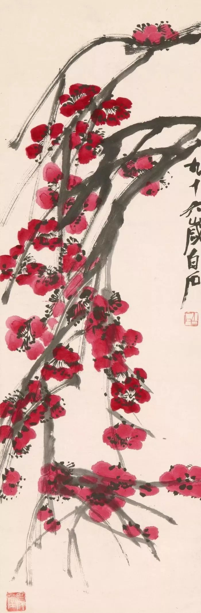 枝条飞舞,疏影横斜,远处,两位红衣人与画中星星点点的墨、绿、红遥相呼应。