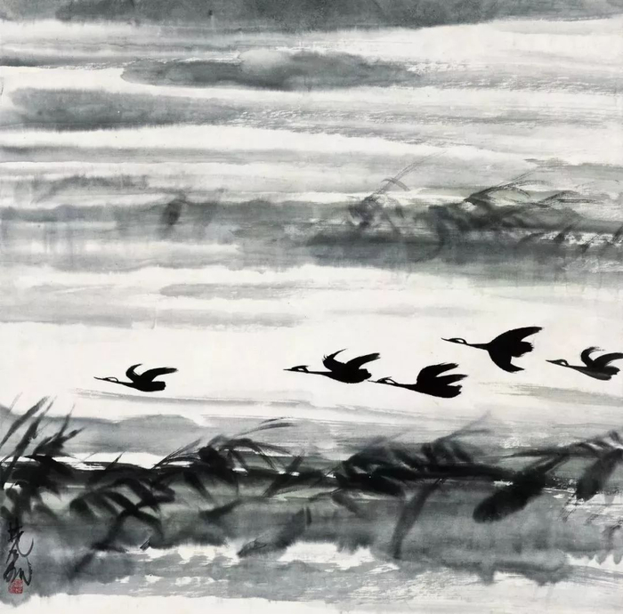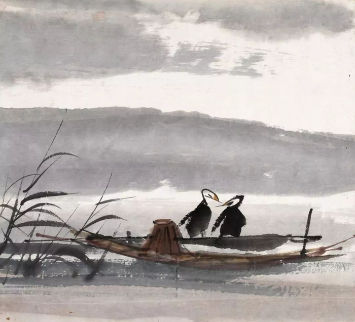 林风眠的两幅画作,一幅远山悠远简淡,近舟静谧安然,给予观者以寂静空灵之感;一幅一群寒鸦打蒲草中飞过,烟波浩渺,一片凄凉苦楚之象。