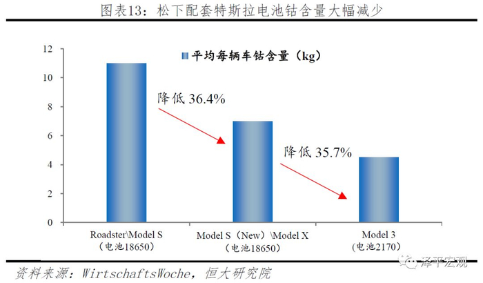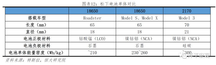 松下与特斯拉深度绑定,采用镍钴铝酸锂(NCA)路线,并以18650和21700圆柱电池闻名。横向来看,当竞争对手2013年做磷酸铁锂电池与NCM111时,特斯拉和松下已经着手使用NCA三元电池;当竞争对手2017年开始由低镍材料过渡到NCM622/NCM811高镍正极材料时,特斯拉和松下探索更高能量密度的硅碳负极应用。纵向来看,特斯拉和松下一直坚持使用NCA作为电芯正极材料,并不断提高镍含量、降低钴含量。对比最新Model 3与Roadster两款汽车,特斯拉平均每款车钴含量降低约60%。根据特斯拉2018年一季度报告,Model 3的电芯能量密度超过其他任何一款竞品所使用的电芯,其钴含量低于主流电芯制造厂即将量产的下一代NCM811电芯产品。