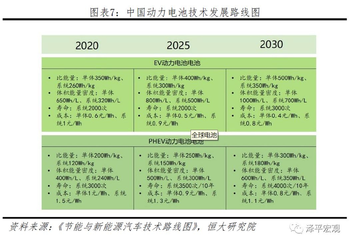 2)2025年应满足400km以上纯电动汽车需求:单体能量密度达400Wh/kg和800Wh/L、单体比功率达1000W/kg、单体成本降至0.5元/Wh、循环寿命2000次。