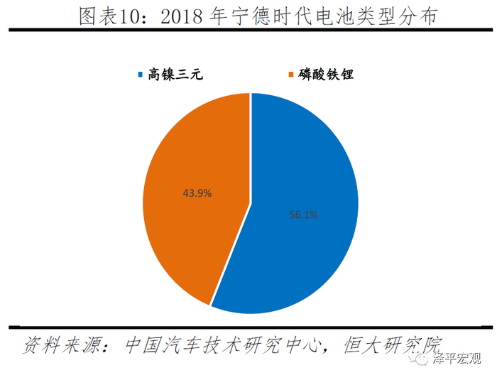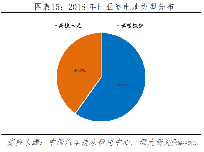比亚迪动力电池主要用于自供,产品类型有方形高镍三元和磷酸铁锂电池两种,2018年出货量13.8GWh,全球占比13%、排为第三。比亚迪不断提高高镍三元电池装机,由2017年15%提升为2018年60%。