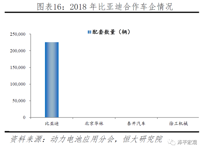 产业链一体化与电池技术的积累虽然使得比亚迪新能源汽车具备一定先发优势,但封闭的供应体系却制约了动力电池部门的快速发展。比亚迪动力电池最大的客户是同集团的比亚迪新能源汽车,2018年配套新能源汽车共22.5万辆,其中比亚迪自供占比高达99.9%,仅约80余辆供应北京华林、泰开汽车和徐工机械。为改善目前封闭的生态体系,比亚迪加快产业全链拓展向外开放,上游方面,除资产正极、电解液、隔膜等原材料,比亚迪主要通过合资形式进行锂资源、前驱体等资源开发。中游方面,加快自身电池业务的独立计划,预计2023年单独上市。下游方面,比亚迪积极寻求其他整车企业合作。