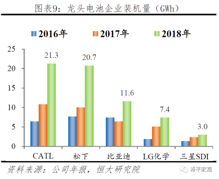从企业层面来看,龙头企业优势突出,市占率不断提高。装机量TOP5的企业市占率不断提升,由2016年的56.7%上升到2018年65.9%。其中,宁德时代、松下与LG化学市场份额占比最高、提升最快,总装机量增幅最大。2018年宁德时代装机量21.3GWh,市占率22%;松下装机量20.7GWh,市占率21.4%;LG化学装机量7.4GWh,市占率7.6%。前三大企业在技术、工艺等领域各具竞争优势。松下是全球最先实现NCA18650+硅碳负极圆柱电池量产的企业,在电化学体系、生产良率与一致性方面居于领先地位;宁德时代率先实现了NCM811方形电芯的量产,并成功运用于广汽与宝马,技术路线上成功实现由NCM523向NCM811的过渡;LG化学的优势在于其对化学材料的理解,技术路线为软包电池,是国际上最先掌握层压叠片式软包的企业,而在NCM811的应用上,则落后于宁德时代。