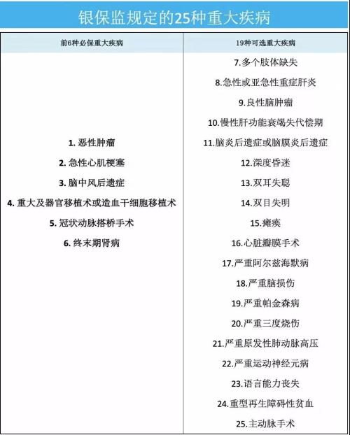 2007年4月,中国保险行业协会与中国医师协会联合制定并出台了我国首部《重大疾病保险的疾病定义使用规范》(下称《规范》),对重疾险产品中最常见的25种疾病的表述和相关保险术语进行了统一,做了明确表述。