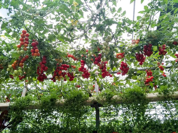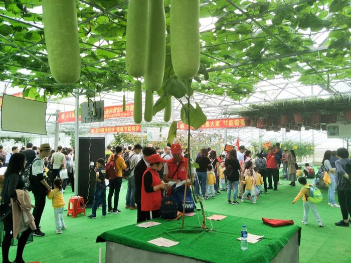 智慧大棚里的锦屏藤万条垂丝,自成一景,又名“一帘幽梦”,兼具遮阴、屏障的作用;西红柿、黄瓜常见蔬菜采用立体栽培、管道式栽培模式种植,向参观者展示高效栽培生产技术。其中,蔬菜树式栽培最为亮眼,一颗植株茎蔓做“树干”,枝叶延展半个棚顶,可培育圣女果、西瓜、红薯、瓠子、葫芦瓜等多种瓜果,单株高产,量达千斤。其原理是利用蔬菜草本植物多年生长的特征,充分挖掘单株高产的潜力,主要引进栽固体基质无土栽培技术系统,利用连栋日光温室进行树式栽培,基础设施主要由栽培槽、基质、贮液池、供液与排液系统、秧体支撑设施等组成。