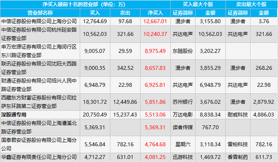 龙虎榜净买入金额前三的营业部是中信证券上海分公司、中信证券杭州延安路证券营业部、申万宏源上海闵行区东川路证券营业部,净买入金额分别为12667.01万元、10240.37万元、8975.49万元,买入金额最大的个股分别为漫步者、共达电声、东睦股份,所对应的买入金额分别为3155.8万元、10562.03万元、3202.27万元。