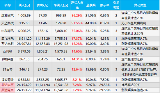 龙虎榜净买入占比最高的三只股票是成都燃气天迈科技中科海讯,净买入金额为968.59万元、24.2万元、868.1万元,净买入占比分别为96.29%、91.55%、75.06%。