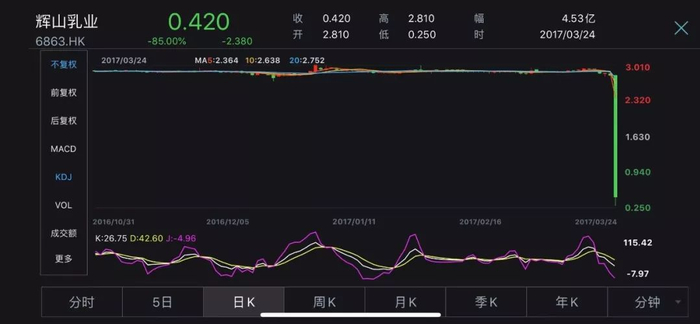 2017年3月24日上午,辉山乳业股份于交易时段内的最低价格跌至0.25港元,报收0.42港元,较前一日收盘价大跌约85%。