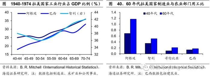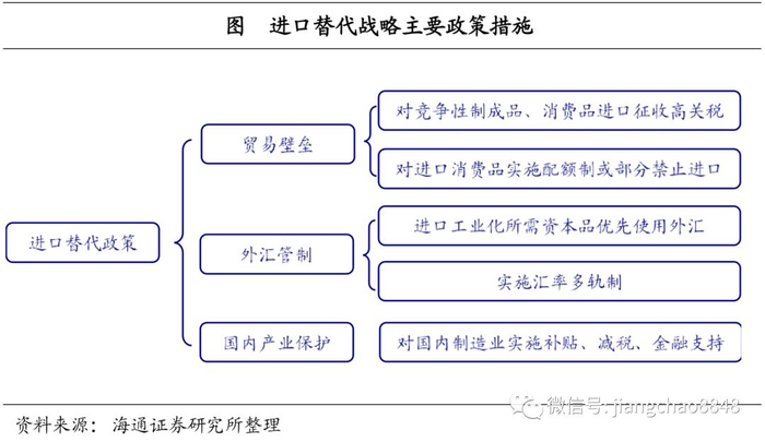 进口替代的工业化之路。早期拉美国家以出口初级产品为主,但1930年代全球大萧条使其经济遭受了严重冲击。萧条过后,阿根廷、巴西、智利、哥伦比亚等拉美主要国家痛定思痛,相继走向了进口替代的工业化道路,其核心是限制工业品进口,并采取措施发展本国制造业,以实现本国产品对进口工业品的替代,促进本国工业化水平提升。在进口替代战略的指引下,对本国企业的政策保护逐渐加强,主要措施包括建立以关税手段为主的贸易壁垒、外汇管制以及补贴国内制造业企业等。