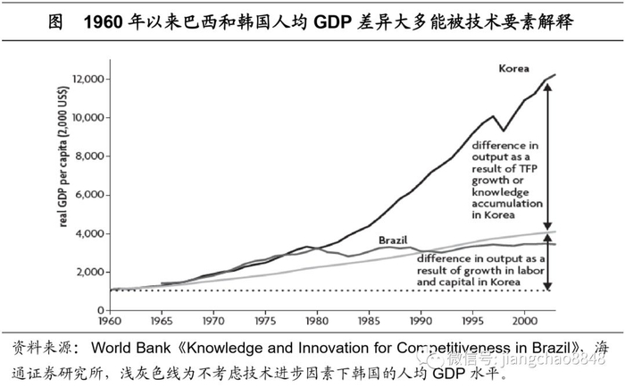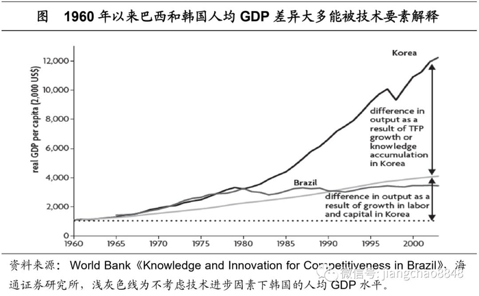 悲情拉美:国家百年失落,收入增长迟缓。20世纪初其实拉美国家已经比较富足,但经历了百年发展,却逐渐走向了衰落,这与其选择的发展道路密不可分。早期拉美国家以出口初级产品为主,但1930年代全球大萧条使其经济遭受了严重冲击,在痛定思痛之后,相继走向了进口替代的工业化道路。进口替代初期的确带来了拉美国家工业化程度的加深,但其科技实力并未同步提升,政府的过度保护使得企业创新动力较弱,研发投入强度长期偏低。根据世界银行的测算,1960年以来,巴西和韩国在人均GDP上所形成的巨大差异,绝大多数都能够被技术进步所解释。