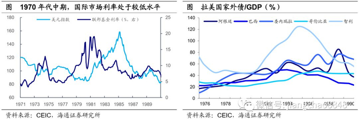 贫富悬殊抑制内需,外债过度爆发危机。贫富差距扩大抑制了拉美国家内需的释放,供需矛盾日益凸显,这就使得其深化进口替代的发展战略选择,面临着“出口竞争力下滑、进口仍在持续增长”的困境,国际收支压力不断增大。而70年代中后期国际市场利率的走低,则促使拉美各国大量举借外债,以进一步实现进口替代工业化进程。80年代初,拉美各国外债存量均达到年出口额的2倍以上,82年阿根廷和巴西外债存量超过当年出口额的4倍。出口能力弱化令拉美国家偿还外债的能力不断削弱,最终爆发债务危机。