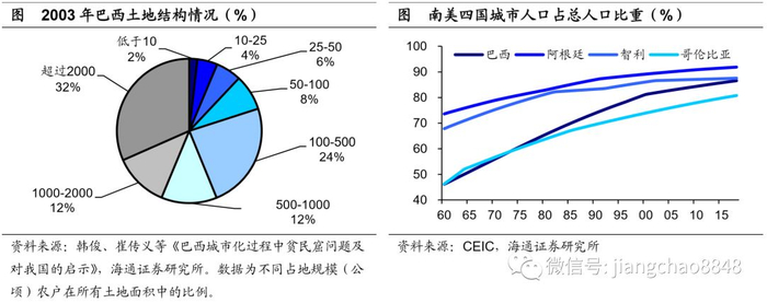 首先,土地集中未见缓解,贫富分化重要根源。在经济发展的过程中,土地集中问题在拉美国家一直未得到缓解,以拉美第一大国巴西为例,03年其土地构成中,占地面积超过2000公顷的大农户仍占据全国土地面积接近三分之一,而占地面积不足10公顷的农户所拥有的土地面积仅2%,高度集中的土地状况延续到现在,是拉美国家贫富分化不断加剧的重要原因之一。