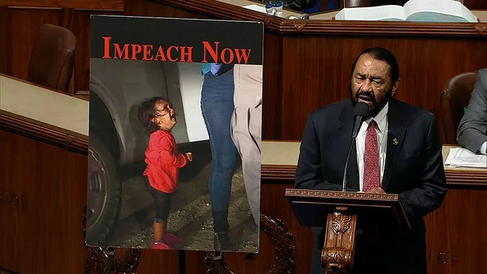 民主党众议员艾尔·格林弄出了一张海报,上面有一个非法移民女童哭泣的样子。大概是要说明他弹劾特朗普有理。