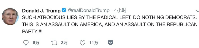 在今天国会弹劾辩论开始前,特朗普总统再次怒发推特。他说:“激进左派如此凶残的谎言,对民主党毫无用处。这是对美国的攻击,是对共和党的攻击!!!!”在推文结尾他连用了四个叹号。