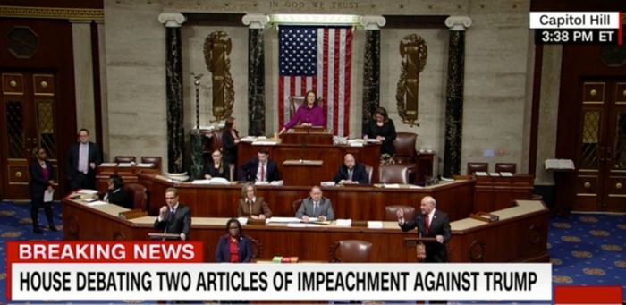 北京时间12月19日凌晨(华盛顿时间18日午间),华盛顿国会山435名众议院议员云集,对弹劾特朗普总统的议案举行辩论和投票。
