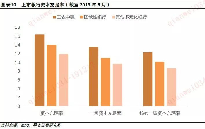 我国工农中建四大行被巴塞尔协会列为全球系统重要性银行,但我国尚未发布我国的系统重要性银行清单(D-SIFs),下图将我国上市银行分为三部分:工农中建、其他多元化银行(招商银行、交通银行等9家银行,很可能被列为我国的D-SIFs)、区域性银行(北京银行、杭州银行等16家银行)。各上市银行均满足《商业银行资本管理办法》对“系统重要性银行”资本充足率的要求;其中四大行资本充足率最高,各级资本充足率高出要求超3个百分点;其他多元化银行未来补充资本压力最大,其一级资本充足率仅高出要求0.55%。