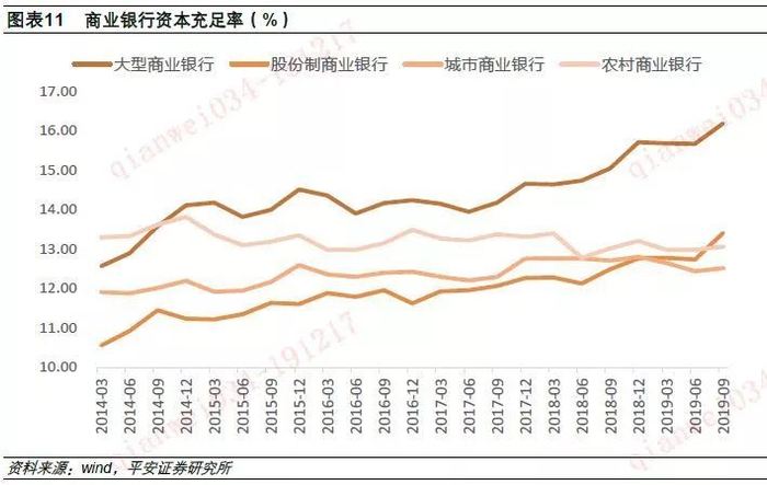 (1)2019年,经济下行压力将推升商业银行坏账率,宏观政策逆周期调节经济需要银行加大信贷投放,资管新规继续推行表外资产回表,都将显著增加银行资本耗用。2013年的《商业银行资本管理办法》要求商业银行在2018年底前达到规定的资本充足率监管要求,其中系统重要性银行资本充足率、一级资本充足率和核心一级资本充足率分别要求达到11.5%、9.5%和8.5%,其他银行也要分别达到10.5%、8.5%和7.5%。