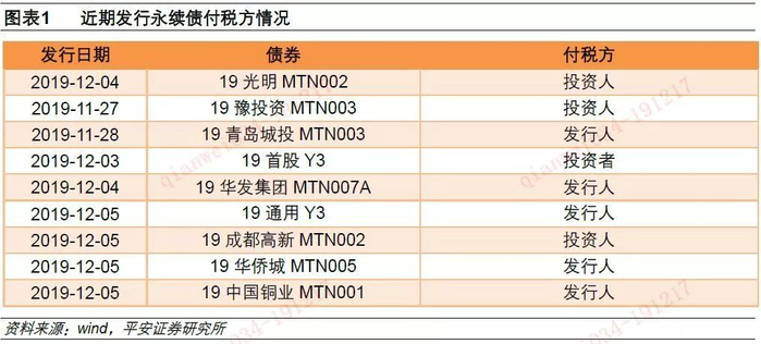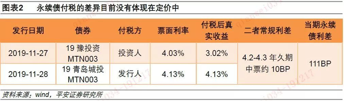 实践中发行人、投资人付税两种模式均有,发行人付税、投资人免税尚未有效体现在定价中。新发行的永续债分为发行人付税和投资者付税两种类型,二者在定价中应该体现票息*25%的价差,但目前市场似乎并未有效定价。例如11月27日发行的19豫城投MTN003和11月28日发行的19青岛城投MTN003,二者均为AAA评级,两个主体同为4.30年久期的公募债估值相差10BP,若二者税收条款一致,我们粗略认为新发行的3+N年信用债估值应该大致相差10BP。事实上,19豫城投MTN003为投资者付税,而19青岛城投MTN003为发行人付税,考虑税收后二者实际定价相差111BP。