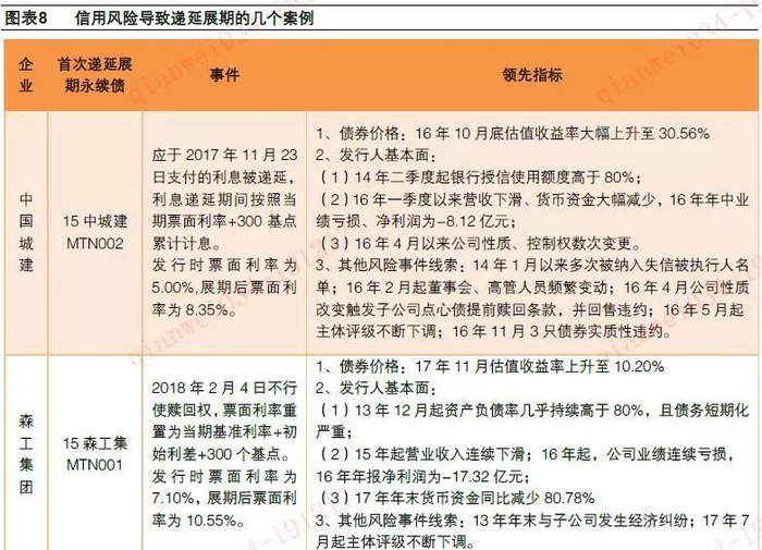 2)发行人爆发信用风险,无法全额赎回永续债,选择展期,实则更接近违约,代表债券有15中城建MTN002、15森工集MTN001、15宜化化工MTN002、17凤凰MTN001等。