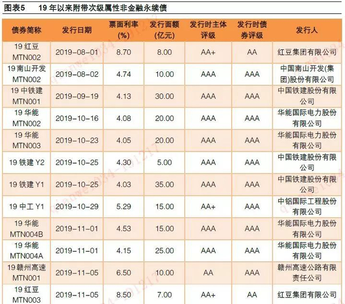 19年财政部新规发布以来,次级永续债发行越来越多。2019年1月30日,财政部发布《永续债相关会计处理的规定》,明确清偿顺序在一般债权之后(次级属性)作为永续债计入权益的条件之一。2018年8月以来,红豆、中铁建、华能等发行人试水次级永续债,截至2019年11月末,该类永续债成功发行19支(包含2018年末发行的18越秀MTN007)。