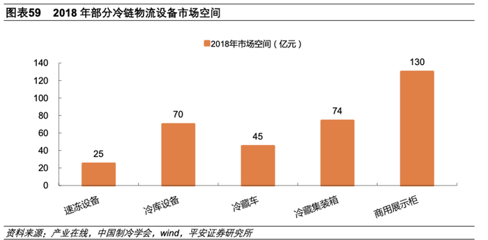 冷藏车和冷藏集装箱主要用于冷链运输环节。根据中冷联盟的数据,2018年我国冷藏车销量约3.7万辆,按照每辆价格12万元测算,市场空间约45亿元。