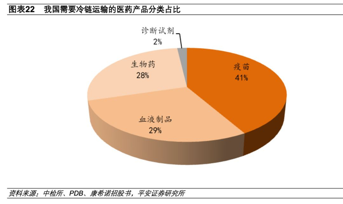 医药冷链有望成为冷链物流未来发展中最为强劲的细分品类。药品流通指药品从出厂到医疗机构或零售药店之间经历的一系列运输储存环节。根据米内网数据,2018年我国公立医院、基层医疗机构、零售药店三大终端的药品销售额为1.73万亿元,同比增长6.3%。冷链流通是药品流通中重要组成部分,也是药品流通中最具前景的业务分支。需要冷链运输的医药领域产品包括:疫苗、生物制品、生物药、诊断试剂等。2018年我国需要冷链运输的药品销售额约1100亿元,其中疫苗占比最大,为43%。按照医药冷链运输的费用率为12%来测算,我国医药冷链市场规模约为130亿元(未统计第三方医药冷链数据)。几大品类药品的持续扩容将带动医药冷链行业的增长,未来几年行业增速预计接近15%,且具有持续性。