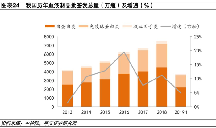 血液制品的主要品种包括白蛋白、静丙、凝血因子类、以及特殊免疫球蛋白。白蛋白类由于终端市场相对成熟,增速稍低。静丙、凝血因子、特免类产品将维持较高增速,市场空间可观。预计血液制品行业的增速在5%-10%。