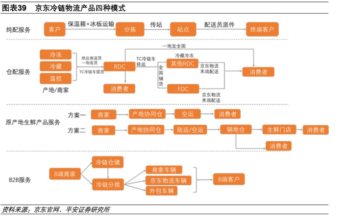 京东的冷链物流产品有纯配服务、仓配服务、原产地生鲜产品服务、B2B服务四种模式。