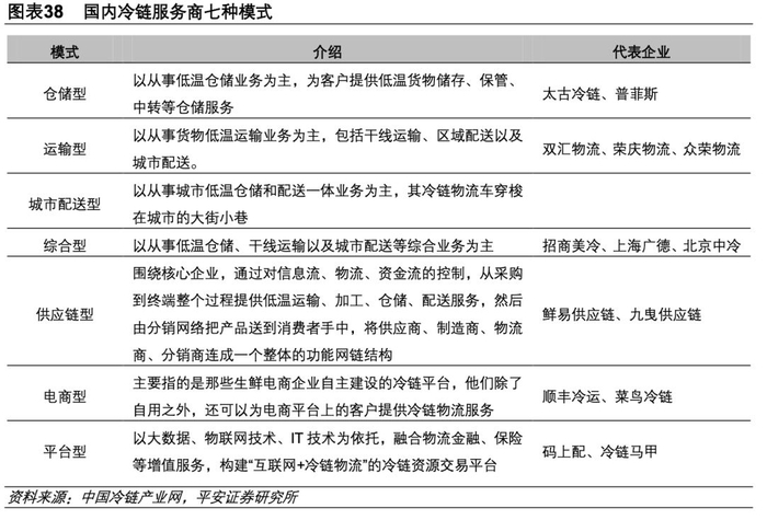 冷链物流市场的竞争者可以分为四类,分别为:由传统物流企业转型,生产商自建自营的冷链部门,专业冷链服务商,国外冷链巨头联手国内企业设立的合资企业。纵观国内冷链服务商,共有仓储型、运输型、城市配送型、综合型、供应链型、电商型和平台型七种模式。