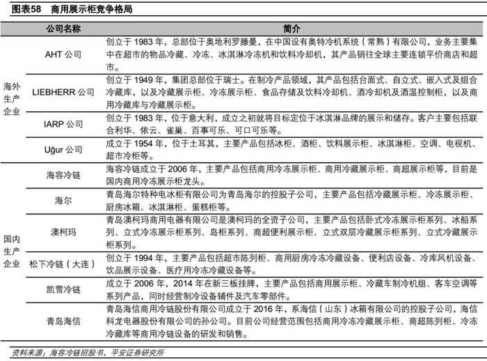 海容、海尔、澳柯玛、海信是主要生产企业,海容在冷冻展示柜市场规模最大。商用展示柜海外生产企业包括:AHT、LIEBHERR、IARP、Epta、Uğur等公司,国内生产企业包括海尔、澳柯玛、海信、松下(大连)、凯雪冷链、海容冷链等公司。目前海外公司在国内供货较少,国内市场主要由国内公司竞争。国内有影响力的冷柜生产企业包括海容、海尔、海信和澳柯玛。其中海容冷链在冷冻展示柜市场上规模最大,未来有望成长为国内商用展示柜绝对龙头。