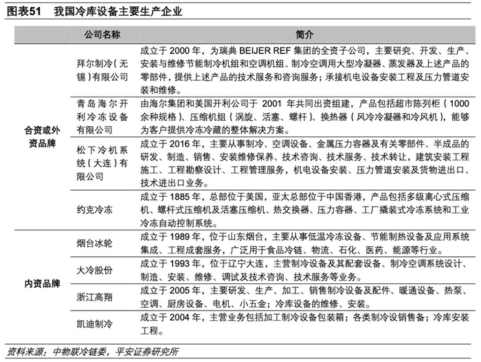我国冷库设备主要外资和合资品牌包括拜尔制冷、海尔开利、松下冷机、约克冷冻,国内两大龙头为大冷股份和烟台冰轮。