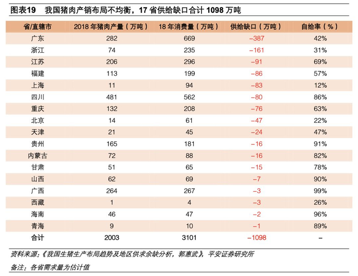 我国猪肉产销布局不均衡,17省供给缺口合计1098万吨。我国生猪产区和销区布局极不均衡,如猪肉消费大省广东,估计18年消费量约669万吨,但猪肉产量仅282万吨,缺口387万吨需从外省调入,估计全国17省供给缺口共1098万吨。其中缺口前五的省份合计807万吨,均为销区东南沿海省份,消费水平较高,对冷鲜肉接受程度更高。预计未来2-3年内将加速推动当地冷链物流发展。