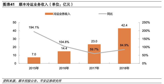 顺丰是一家直营制的快递龙头企业,除了传统的快递业务,顺丰的新业务包括时效业务、经济业务、重货业务、冷运业务、国际业务、同城配业务。2018年度冷运业务收入达42.4亿元,同比增长84.9%,增速仅次于同城配业务,是顺丰新业务中的强势板块。