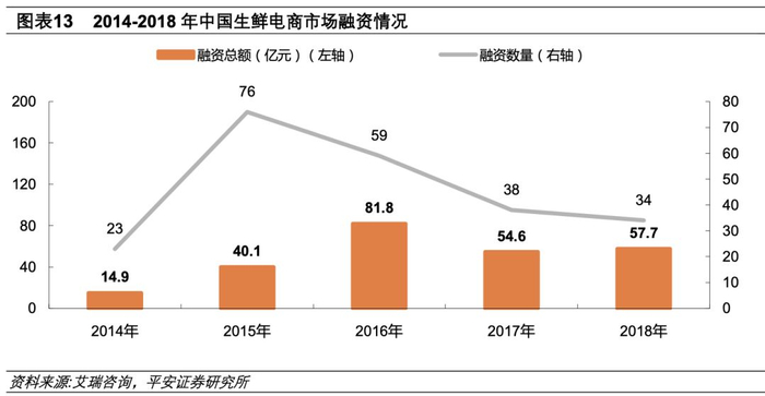 生鲜电商正处于资本加速进场时期,扩张脚步仍将持续。2009年资本市场开始关注生鲜电商;2009年~2013年这5年间,一共完成6.2亿元融资;2014年~2018年,生鲜电商完成融资总金额达249亿元,其中2016年、2017年、2018年连续三年融资额均超过50亿元。