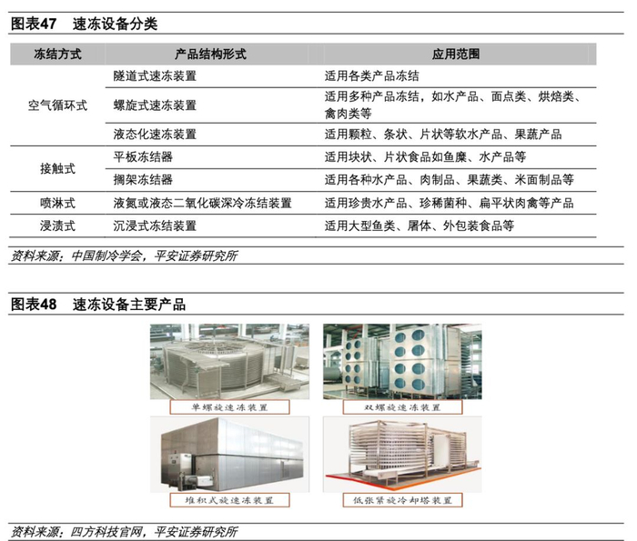 速冻设备指能够在短时间内冻结大量农产品、水产品、牲畜等产品的冻结设备。速冻设备通常分为空气循环式、接触式、喷淋式和浸渍式四类。