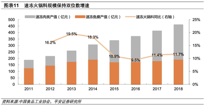 目前我国人均速冻食品年消费量不足10千克,仅为日本的一半,欧洲和美国更是分别高达35千克和60千克,以此判断速冻食品仍有较大增长空间。其中速冻火锅料(主要由速冻鱼糜+速冻肉类组成)受餐饮火锅行业快速发展的刺激,连续多年保持双位数的同比增长。我们认为,速冻食品行业特别是速冻火锅料的发展,将提持续升对冷链运输的需求,利好冷链运输和储藏设备行业的发展。