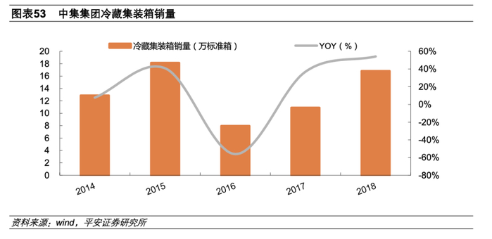 冷藏集装箱属于特种集装箱,具有良好的隔热,且能维持一定的低温要求。冷藏集装箱主要用于冷却或冷冻货物的储藏和运输。中集集团是全球冷藏集装箱龙头,2018年中集集团冷藏集装箱销量为16.8万标准厢,合计实现收入50.2亿元。2018年中集集团国内收入和国外收入占比分别为88%和12%,假设冷藏集装箱收入构成和全部收入构成相同,则2018年中集集团国内冷藏集装箱收入为44.2亿元。我们按照中集集团国内市占率为60%来测算,2018年我国冷藏集装箱市场空间约74亿元。