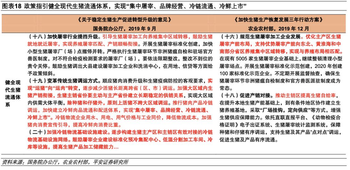 在非洲猪瘟常态化下,政府加快引导健全现代生猪流通体系:“运猪”向“运肉”转变,加快建立冷鲜肉品流通和配送体系。国务院办公厅2019年9月出台《关于稳定生猪生产促进转型升级的意见》,提出“健全现代生猪流通体系”的重要任务: