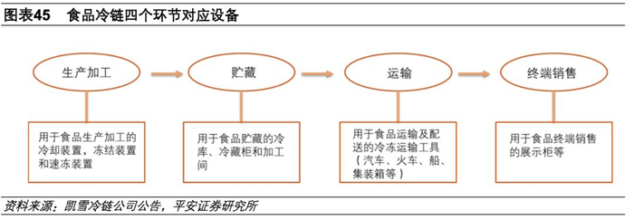 商用制冷设备是冷链物流的核心设备,我们称作为冷链物流设备。食品冷链是冷链物流的典型代表,占比近90%,食品冷链通常分为食品生产加工、贮藏、运输和终端销售四个环节。每个环节均有对应的制冷设备,如生产加工环节的速冻装置、贮藏环节的冷库、运输环节的冷藏车和冷藏集装箱,以及终端销售的商用展示柜等。