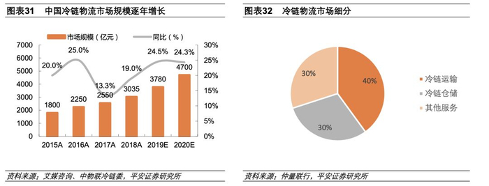 冷链物流:行业快速发展,巨头加速布局:2018年我国冷链物流市场规模达3035亿元,同比增长19%,预计2019年和2020年分别增长24.5%和24.3%,冷链物流处于快速发展时期。目前我国冷链物流以食品冷链为主,行业集中度低,2018年百强企业市占率仅为13.8%。随着国家支持冷链物流相关政策的连续发布,越来越多的资本关注冷链物流行业,京东、苏宁、顺丰等电商巨头和快递巨头加速布局冷链物流领域。