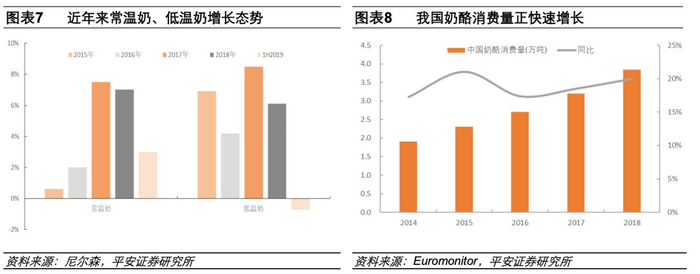 3)更具营养价值的低温奶正逐渐崭露头角:低温奶和常温奶在生产工艺上存在根本区别,低温奶采取巴氏杀菌法,保留了生乳本身各种天然活性物质和酶的高活性,有助于维护肠道菌群生态平衡、提高人体免疫功能等,并最大限度保留了牛奶的营养成分和纯天然风味。常温奶采取超高温灭菌法,酶的活性基本被破坏,对人体有益的微生物也全部被消灭,对营养成分的破坏更为明显,对蛋白质、钙、维生素的保留均低于低温奶,因此低温奶的营养价值优于常温奶。低温奶需冷链保存及运输、运输半径有限导致终端价格偏贵。随着人均收入提升,消费者对低温奶的偏好正逐渐提升。