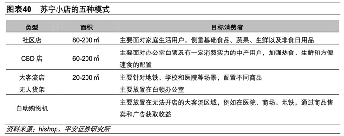 苏宁小店是全部采用自营模式的O2O购物平台,苏宁小店的商品分为快消品和生鲜两类,生鲜产品主要来源于国内最大生鲜电商易果生鲜。苏宁小店支持线上线下两种方式购物。截至2019年6月底,苏宁小店及迪亚天天自营店面合计5,368家,迪亚天天加盟店42家。与苏宁小店模式类似的有京东便利店、天猫小店。